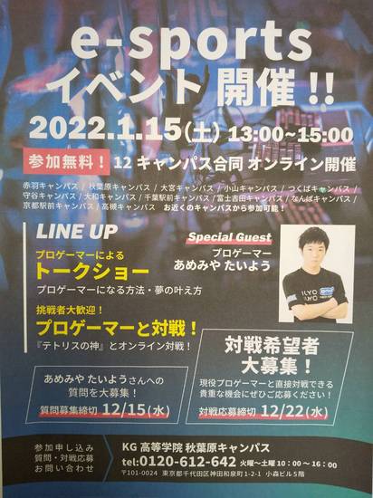 e-sportsイベント開催! 2021-12-11 イベント KG高等学院 秋葉原個別指導キャンパス(提携鹿島朝日) e-sportsイベント開催! 現役プロゲーマーのあめみやたいようさんと対戦できるイベントを開催します! 【日時】 2022年1月15日(土) 13:00~15:00 参加無料 お問い合わせは下記まで 0120-612-642 KG高等学院秋葉原キャンパス(火~木、土曜10:00~16:00) 一覧へ