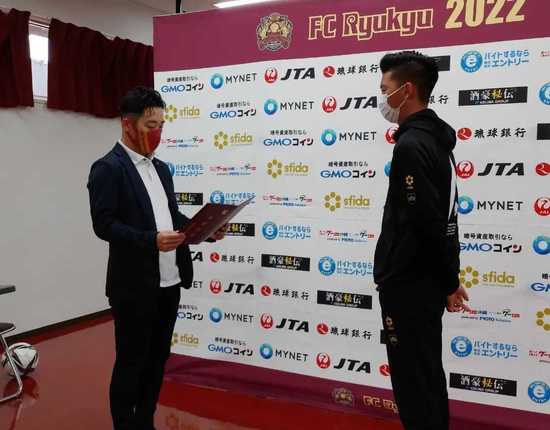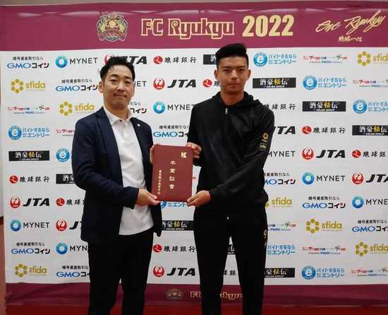 「この度はご卒業おめでとうございます。スペインから帰ってきて、トップチームの練習と学校の課題の両立は大変だったと思いますがよく頑張りました。これからは、FC琉球高等学院の卒業生、また、プロサッカー選手としてトップチームでも活躍してくれることを期待しています。」