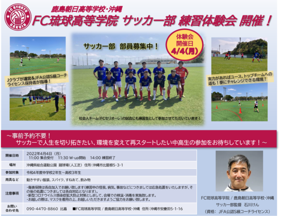 この度、FC琉球高等学院 / 鹿島朝日高等学校・沖縄 サッカー部 創部に伴い、生徒募集活動として練習体験会を開催致します!