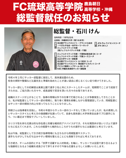 日頃より、FC琉球高等学院 鹿島朝日高等学校、沖縄サッカー部の活動にご理解ご協力、応援を賜り、誠にありがとうございます。この度、チームのさらなる発展を目指し、岡根コーチを監督に、監督であった石川を総監督として組織を編成することになりましたのでお知らせいたします。