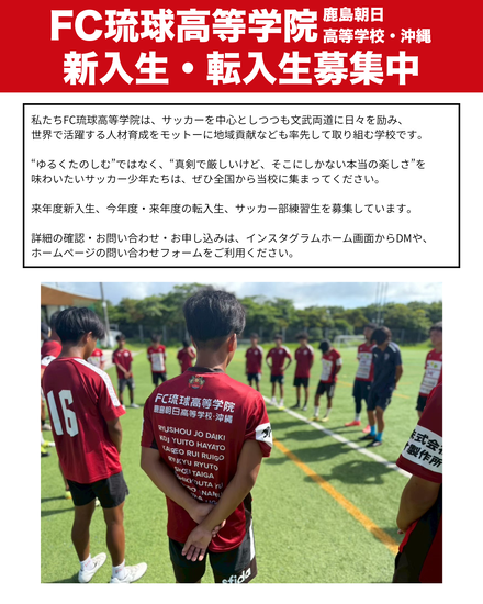 ただいま、FC琉球高等学院 鹿島朝日高等学校・沖縄サッカー部では、来年度新入生募集中!