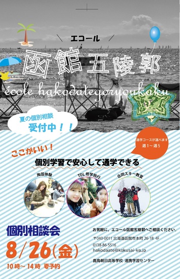 8月26日(金)には、個別相談会も行いますので、通信制高校への入学、転校などをお考えの方は、是非お越しください。