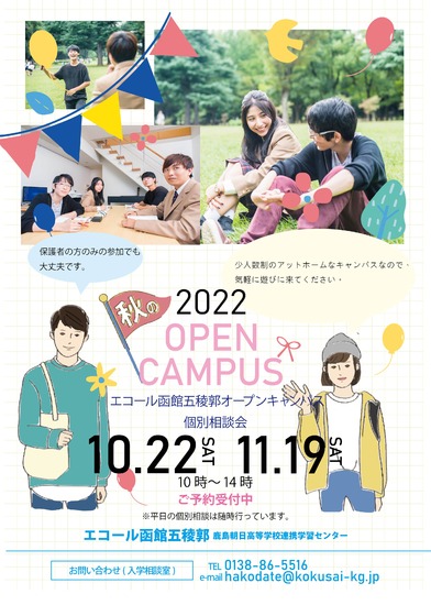 秋の個別相談受付中!! 2022-10-17 お知らせ エコール函館五稜郭 エコール函館五稜郭では、秋の個別相談・教室見学を行っています。 10月22日(土)、11月19日(土)には、個別相談会も行いますので、通信制高校への入学、転校などをお考えの方は、是非お越しください。 【お問合せ先】 エコール函館五稜郭 tell:0138-86-5516(転送:070-3297-7417) メール:hakodate@kokusai-kg.jp 一覧へ