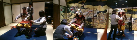 どーだ。鎧かぶとの着付け体験(女の子の場合は十二単だそう)。この日は平日で閑散としていましたのでスタッフさんに引っ張られて体験することに。2人がかりで上から下まで・・・重そう。