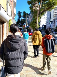 ウォーキングの途中、1人の生徒がしゃがんで何かをしているなと