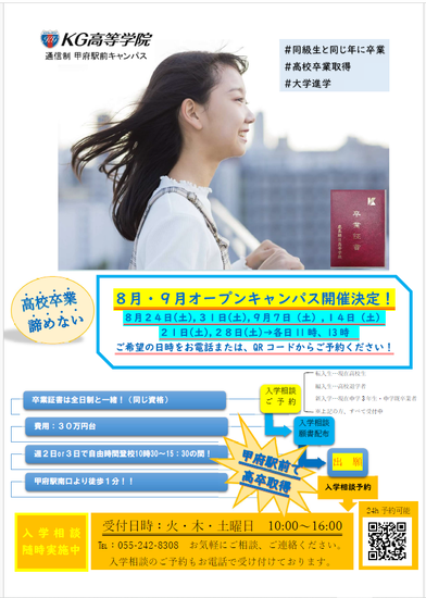 8月・9月オープンキャンパス開催します!! 2024-08-20 お知らせ KG高等学院 通信制 甲府駅前キャンパス 現在高校生、高校退学者、高校未進学者、現在中学校3年生の方、 お気軽にお越しください。 お越しいただくと、より詳しいお話もできます(^^) ↓↓こちらのQRコードからか、お電話ご予約ください KG高等学院 甲府駅前キャンパス 055-242-8308 一覧へ