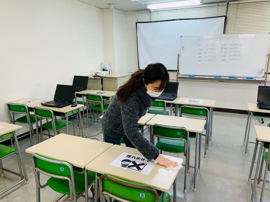 小倉キャンパスでは、定期的に職員で使用する教室の机の消毒、ドアノブ消毒、換気を行っております!