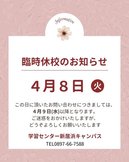 つきましては、4月8日(火)をお休みとさせていただきます。