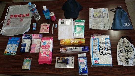携帯トイレ、ビニール袋、アルミホイル、水、除菌シート、タオル、ウェットティッシュ(おしりふき)、マスク、使い捨て下着、懐中電灯、筆記用具、チョコレート、新聞紙、サランラップ、マウスウォッシュ、絆創膏、筆記用具、帽子・・・。