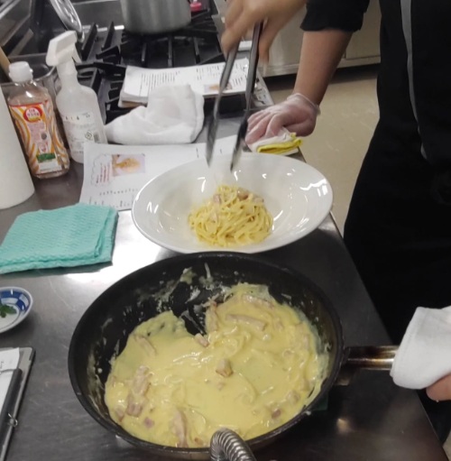 カルボナーラの名前の由来、ベーコンの切り方、牛乳や生クリームを入れる理由、卵を一つ一つ器に入れる理由、パスタの表面がツルツルしたものとザラザラしたものの違い、衛生面の大事さ、料理の彩り(五色)、器の大きさ(余白の大事さ)、盛り付け前に器を今一度綺麗に拭く、立体感を出す盛り付けの大切さ、お客様に料理を出す前に散ったソースを拭く・・・などなど、お客様に料理をお出しする目線で体験授業を進めて下さいました。