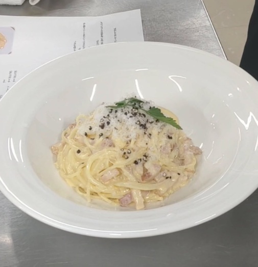 本日の体験レシピはスパゲッティ・カルボナーラ♪