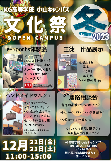 小山キャンパス冬の文化祭のお知らせ 2023-12-11 イベントのお知らせ KG高等学院 小山キャンパス(提携鹿島朝日) 冬の文化祭&オープンキャンパスを開催します! どなたでもご来校いただけますので ぜひお気軽にいらしてください! 一覧へ