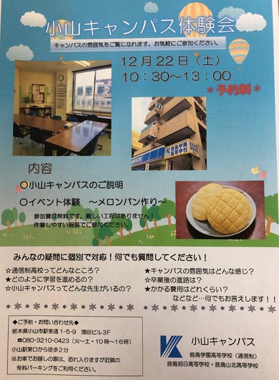 小山キャンパスでは、12月22日(土)にキャンパス体験会を開催いたします。