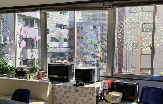 その一環として、多目的スペースの窓ガラスにステッカーを貼り、