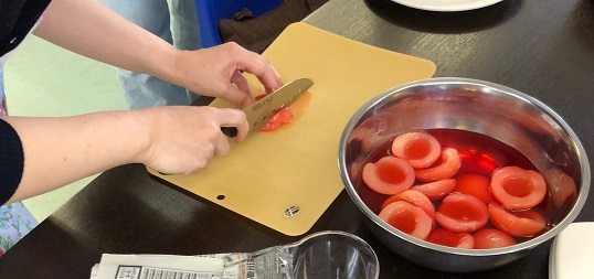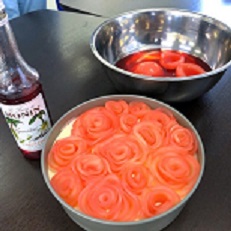 ざくろ液で着色した桃を薄く切り、1枚ずつ丁寧に並べて、バラの形を作ります。