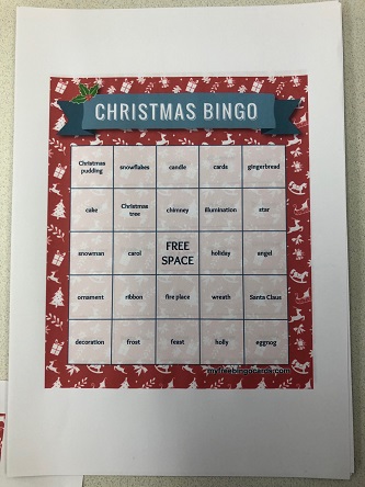 マーシー先生が読み上げた英単語をそろえて、ビンゴを目指しましょう。