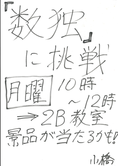 おもしろーい 数学が あるのです!!! 2019-12-09 お知らせ 立川学習センター 鹿島朝日高等学校連携教室 いったい それは 何でしょう? 数字のパズル・・・数独 なんです やり方は、簡単です、ご心配なく! みんな 夢中 になります ぜひ あたたも 一度 どうぞ 一覧へ