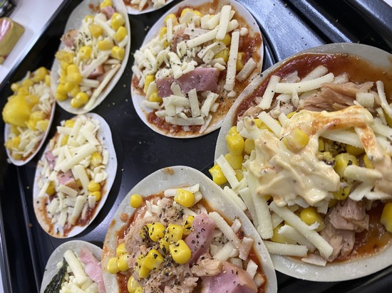 ピザ生地は餃子の生地を使っておかず系デザート系いろんなピザができました!!