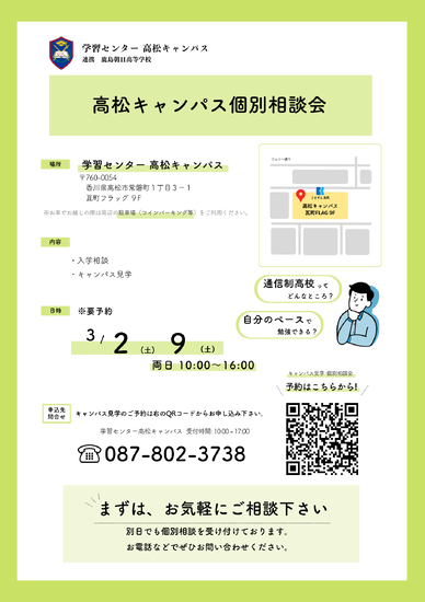 さて、高松キャンパスにて、3月2日(土)と9日(土)の2日間予約制の個別相談会を開催することになりました。