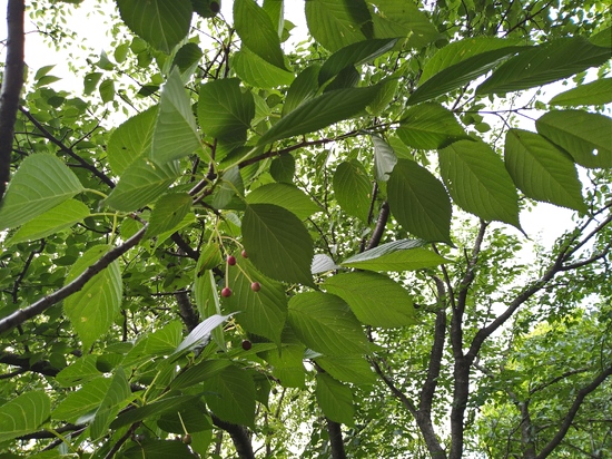 ~約1か月前は 満開だった🌸の樹は・・・・🍃が青々と生い茂っり、可愛らしい🍒赤い実がついていました。(サクランボではありません・・・(^^;))