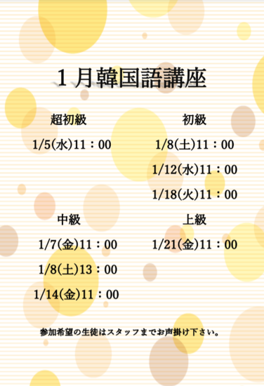 1月の韓国語講座 2022-01-11 お知らせ KG高等学院 富士吉田キャンパス(提携鹿島朝日) キャンパスでは今年も韓国語講座を開講しています! 韓国好きには人気の講座です。 超初級コースもあるので、今年から始めてみるのもおすすめですよ。 一覧へ