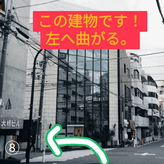 ⑧このガラス張りの建物が見えてきたらもう大丈夫!ここで左へ曲がります。