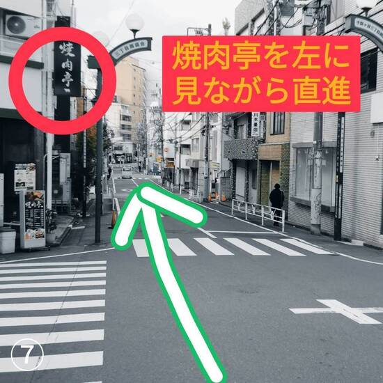 ⑦若干の下り坂になっています。《焼肉亭》を左に見ながら直進します。