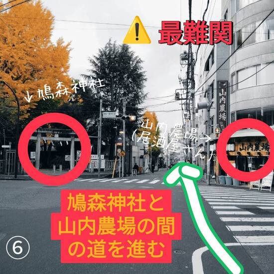 ⑥…はい!ここが最難関です⚠️来た道も含めると五差路の交差点なのですが、左手に《鳩森神社》、右手に《山内農場》の間にある道を進みます。あともう少しです、ファイトー✊