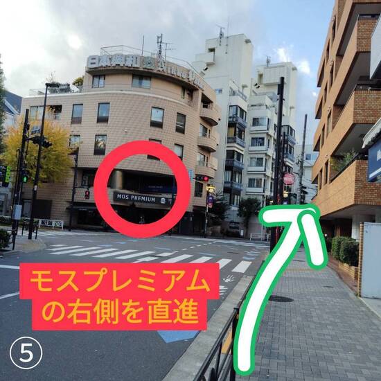 ⑤反対側に《モスプレミアム》が見えていれば、正しい道順です。そのまま右側の道に沿って直進します。《ローソン》や《ドトール》があります。