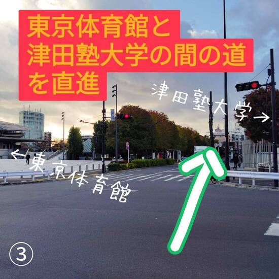 ③駅を背にした時、右手に《津田塾大学》、左手に《東京体育館》が見えます。
