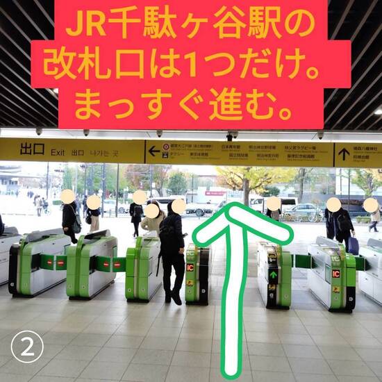 ②《JR千駄ヶ谷駅》の改札は1ヶ所しかないので、とてもシンプルです。改札を出て、まっすぐ進みます。