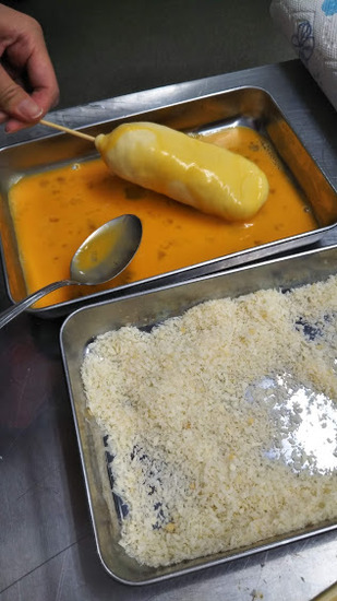 生地をつくり、材料を串にさしたものに生地を巻き、最後は卵、パン粉をつけて