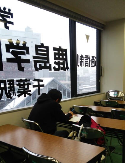 雪が降る中、キャンパスへ勉強にきている生徒もいます。