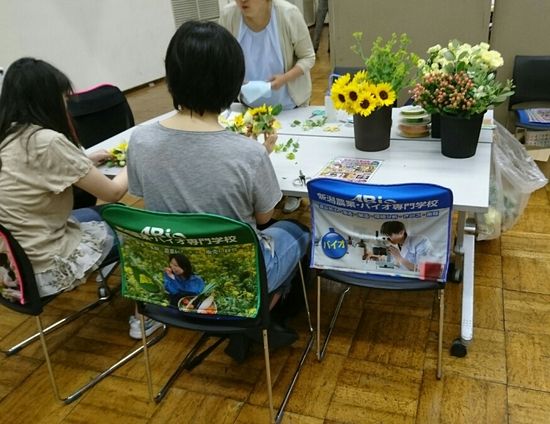お花に関わる仕事です。フラワーアレンジメントを体験しています。お花の色使いや組み合わせを学んでいました。