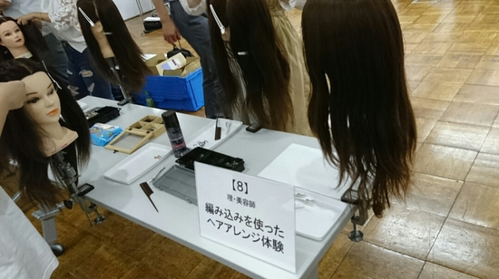 美容に関わる仕事です。ヘアスタイル体験をしています。一人一台の人形を使い、編み込みを使ったヘアアレンジを学びました。