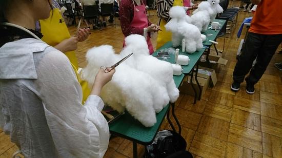 動物に関わる仕事です。犬のぬいぐるみを使い、毛のカットを体験しています。ハサミの使い方からしっかりと指導を受けていました。