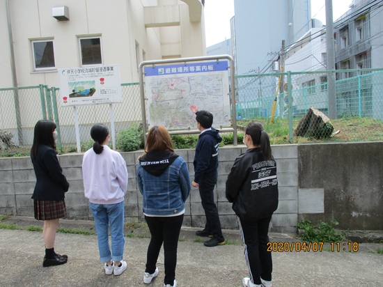ガイダンス終了後は,避難訓練の一環として,キャンパス内の避難経路を確認後,地域の避難場所である千葉市立弁天小学校まで,実際に徒歩で練習しました。