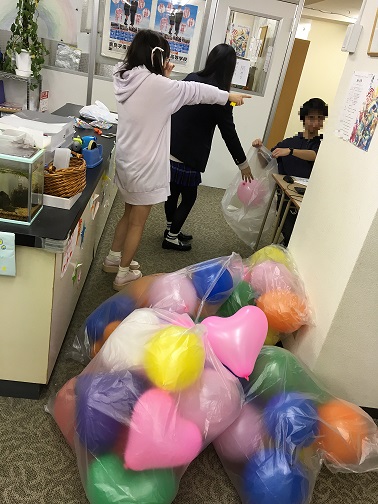 装飾係は110個の風船を膨らませます
