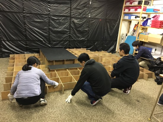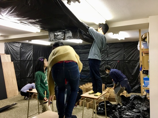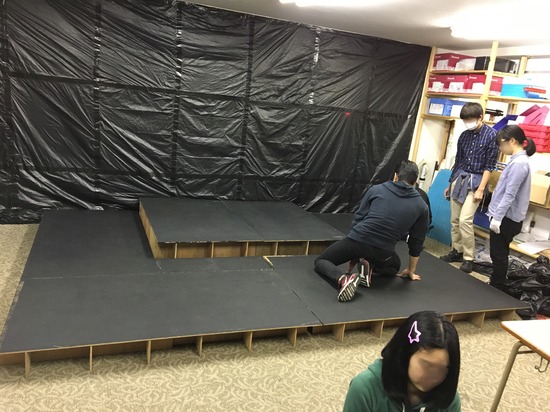 大掃除の後は、キャンパス内の飾りつけ、軽音部発表のためのステージ作り、鹿の子クラブ発表の展示、イラスト部の展示をします。