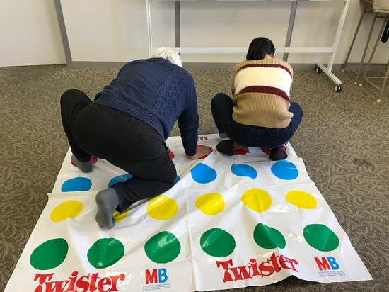 このゲーム、左右の手、左右の足をルーレットで決まった丸の色においていく簡単なルールですが、地味にキツく身体に効いてくるのです。