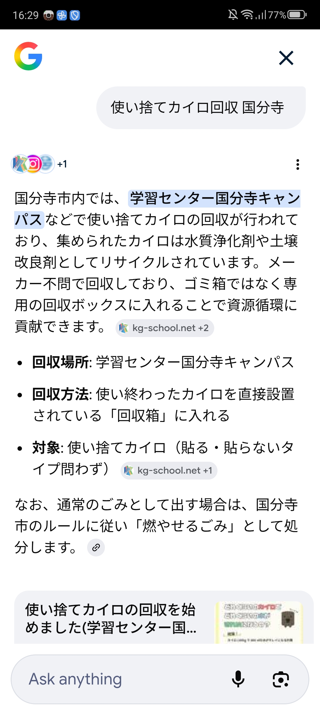 試しに【使い捨てカイロ回収 国分寺】と検索してみました。すると、「鹿島学園高等学校の学習センター国分寺キャンパスは、2025年11月から実施しています」とAIによる概要がヒットしました。AIって、すごいですね。