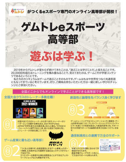 ゲムトレeスポーツ高等部は、ゲームの上達を全国大会クラスのトレーナーからサポートを受けるだけでなく、ゲームで学んだことを発信したり、学びを生徒同士で共有することで学びが深まる流れをつくっていきたいと考えています。また学習サポートについては、カシマの通信のサポート校として、学習計画を作りながら個別に対応をさせていただいています。(以下は1月の東京都で開催されるTOKYOeスポーツフェスタで配布予定のチラシです。)