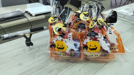 今日はハロウィンなので、登校してくれた生徒にお菓子をプレゼントしています!