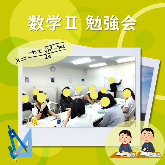 数学Ⅱは数学Ⅰに比べ、格段に難易度が上がります。難しい問題も職員と一緒に取り組めば怖くない!ということで、暑い中でしたが大勢の生徒が参加し、参加者は全員、無事にレポートを提出することができました!!