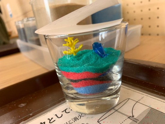 自分たちで好きな色砂を入れて、ガラス小物を中に飾りました。