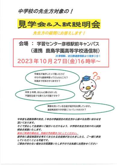中学校の先生方対象の見学会&入試説明会 彦根駅前キャンパスでは、中学校の先生方を対象にした学校説明会を開催します。