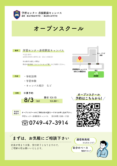 ※令和6年度 第1回 オープンスクール参加者募集を締め切りました 学習センター彦根駅前キャンパス、令和6年度第1回オープンスクールは、定員に達したため募集を締め切らせていただきます。