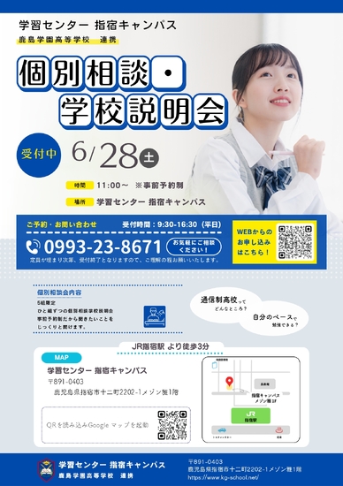 指宿キャンパス説明会開催します! 2025-06-13 お知らせ 学習センター 指宿キャンパス 当日は通信制の仕組み、入学から卒業までの流れ キャンパスのサポート内容など詳しくご説明いたします。 下記QRコードにてお申し込みください。 随時キャンパス見学も受け付けておりますので、 日程が合わない等ございましたらお気軽にお電話にてお問い合わせください。 学習センター指宿キャンパス ☎(0993)-23-8671 一覧へ