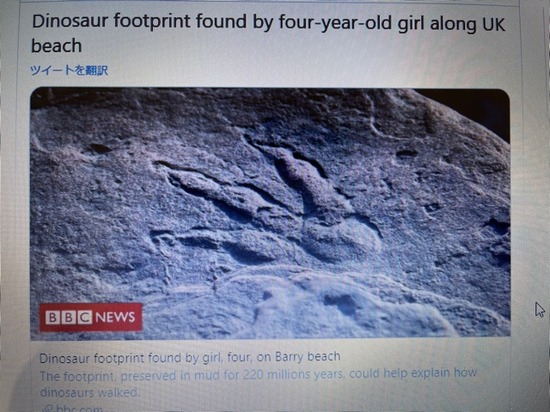意訳「英国の海岸で4歳の少女が恐竜の足跡を発見した」