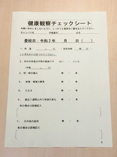 ちなみに、健康観察チェックシートは